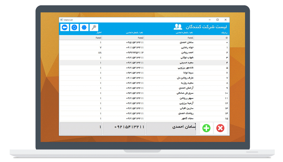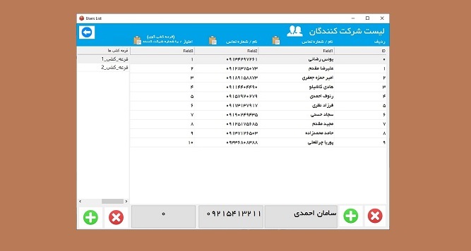 اضافه سازی شرکت کننده جدید به سادگی تایپ نام یا شماره و زدن کلید اینتر ! یا زدن دو کلیک و وارد کردن لیست شرکت کنندگان از نرم افزار اکسل یا هر نرم افزار دیگر